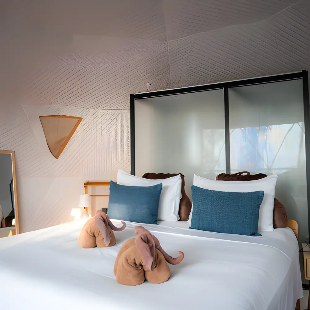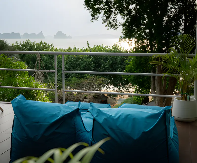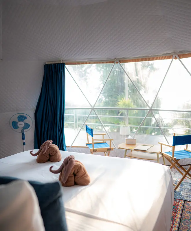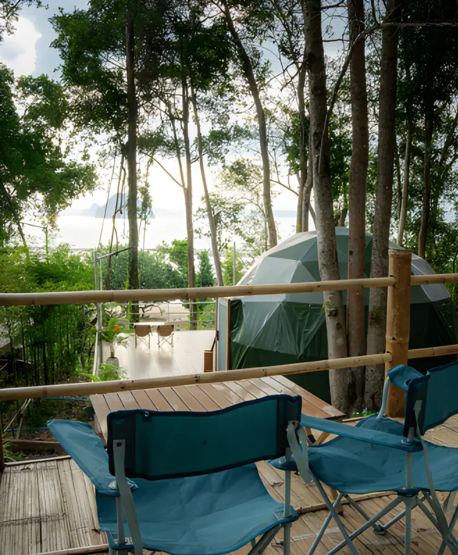 Each dome faces the sea and the stunning rocks of Phang Nga Bay. With air conditioning, comfortable bedding, private bathroom, hot water, and thoughtful layout, they are perfect for couples, friends, or solo travelers. Families are welcome too, of course, with a choice of tents to plant nearby their parent’s dome if your kids don’t feel like staying on an extrabed. Air conditioning keeps nights cool, while soft beds and carefully designed interiors make every dome feel inviting.